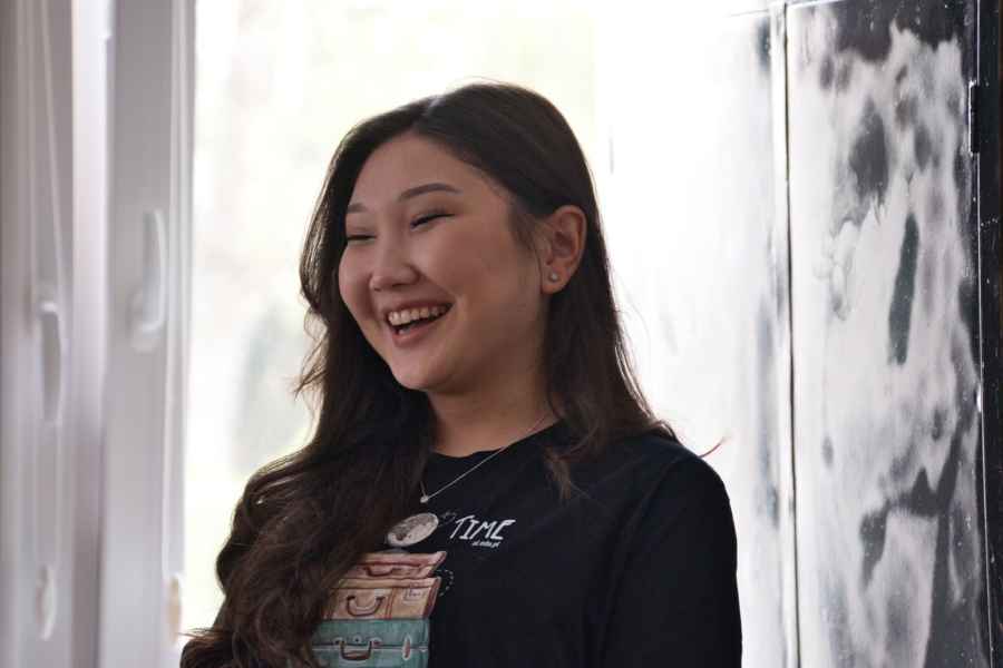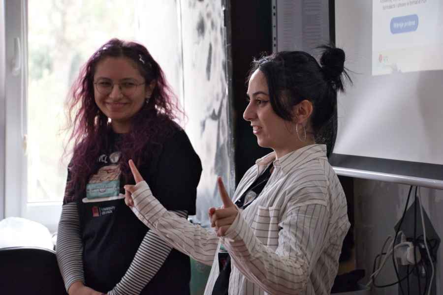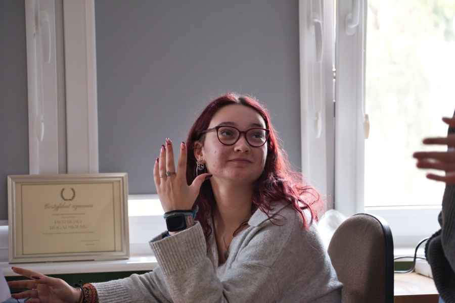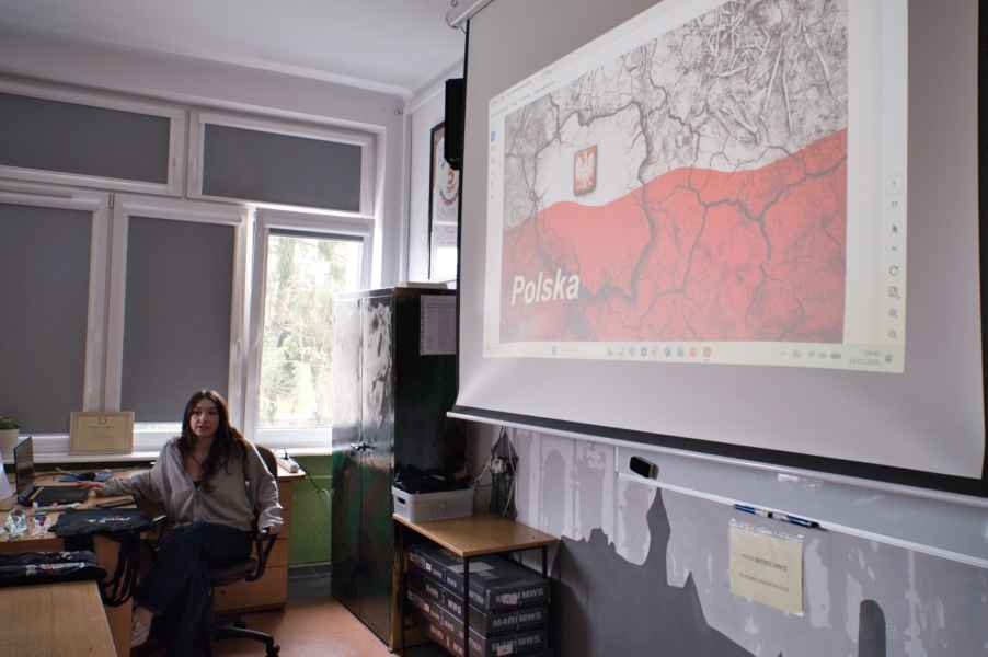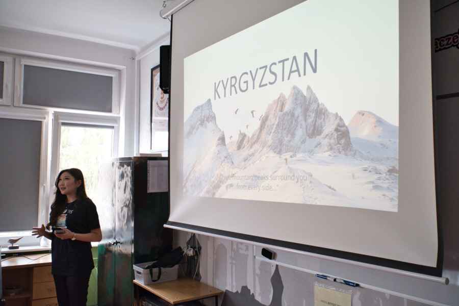Kolejną osobą, która szczególnie zainteresowała uczniów, była Akyalai Kubatbekova, przedstawicielka prawa z Ala Too University w Kirgistanie, która przyjechała do nas z Biszkeku. W swojej prezentacji pokazała zdjęcia najpiękniejszych miejsc w swoim rodzimym kraju, a także zaprezentowała tradycyje gry, potrawy oraz stroje. To właśnie ona otrzymała najwięcej pytań od uczniów, a najbardziej aktywni zostali nagrodzeni naszymi uczelnianymi gadżetami.