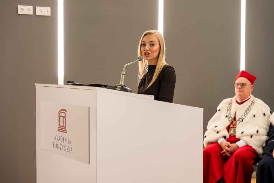 W gronie stypendystów Prezydenta Miasta Łomża jest dwoje studentów Wydziału Nauk Społecznych i Humanistycznych: Izabela Gawęcka (Zarządzanie II stopnia) oraz Mateusz Gutowski (Filologia Angielska I stopnia). Jak wspomina Izabela Gawęcka: "Z ogromną radością i wdzięcznością odebrałam Stypendium Prezydenta Miasta Łomża za szczególne osiągnięcia w roku akademickim 2024/2025. To wyróżnienie to dla mnie dowód, że zaangażowanie i pasja w połączeniu z konsekwencją naprawdę prowadzą do sukcesu. Ogromnie cenię doświadczenia zdobyte w ramach Enactus Akademii Łomżyńskiej, dzięki którym rozwijałam swoje umiejętności przywódcze i komunikacyjne. W ostatnim roku nasz zespół zdobył tytuł Social Media Rocket oraz zajął 3. miejsce w krajowym konkursie Enactus National Competition 2025. Te osiągnięcia motywują mnie do dalszego działania i pokazują, że wspólną pracą można naprawdę wiele osiągnąć."