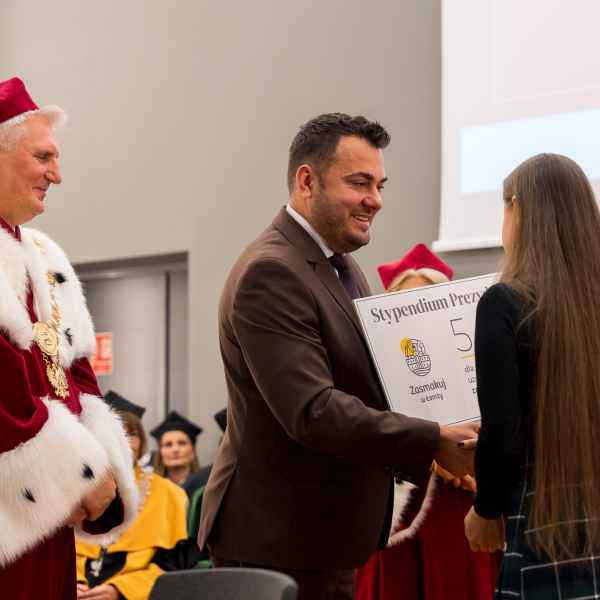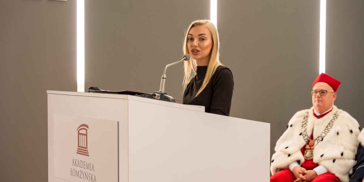 W gronie stypendystów Prezydenta Miasta Łomża jest dwoje studentów Wydziału Nauk Społecznych i Humanistycznych: Izabela Gawęcka (Zarządzanie II stopnia) oraz Mateusz Gutowski (Filologia Angielska I stopnia). Jak wspomina Izabela Gawęcka: "Z ogromną radością i wdzięcznością odebrałam Stypendium Prezydenta Miasta Łomża za szczególne osiągnięcia w roku akademickim 2024/2025. To wyróżnienie to dla mnie dowód, że zaangażowanie i pasja w połączeniu z konsekwencją naprawdę prowadzą do sukcesu. Ogromnie cenię doświadczenia zdobyte w ramach Enactus Akademii Łomżyńskiej, dzięki którym rozwijałam swoje umiejętności przywódcze i komunikacyjne. W ostatnim roku nasz zespół zdobył tytuł Social Media Rocket oraz zajął 3. miejsce w krajowym konkursie Enactus National Competition 2025. Te osiągnięcia motywują mnie do dalszego działania i pokazują, że wspólną pracą można naprawdę wiele osiągnąć."
